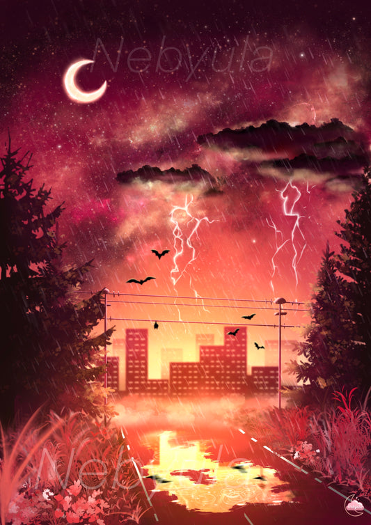 Illustrations digitales formats petites affiches et poster dessinés à la main sur tablette. Thèmes japonais et fantaisie avec un style galactique coloré. Découvrez une variété de paysages imaginés au fil des inspirations du moment, aux couleurs éclatantes et à l'ambiance calme et apaisante pour une décoration murale unique.