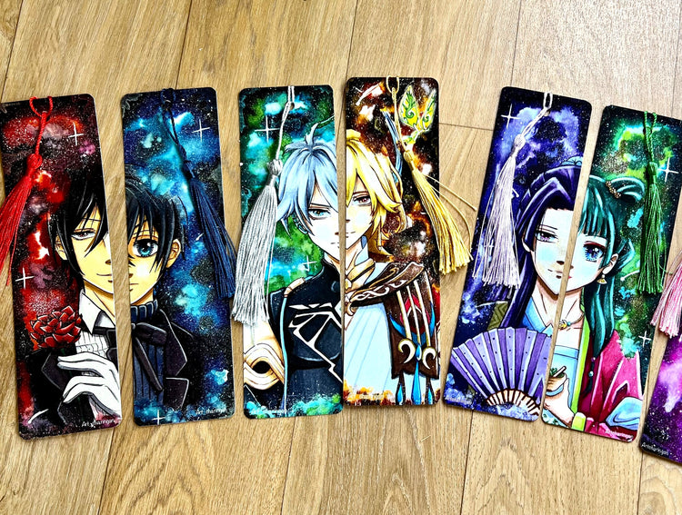 Grande collection de marque-pages manga dessinés à la main à l'aquarelle avec un style galactique coloré. Découvrez une variété de duos de personnages d'animés japonais au style unique pour embellir vos lectures.