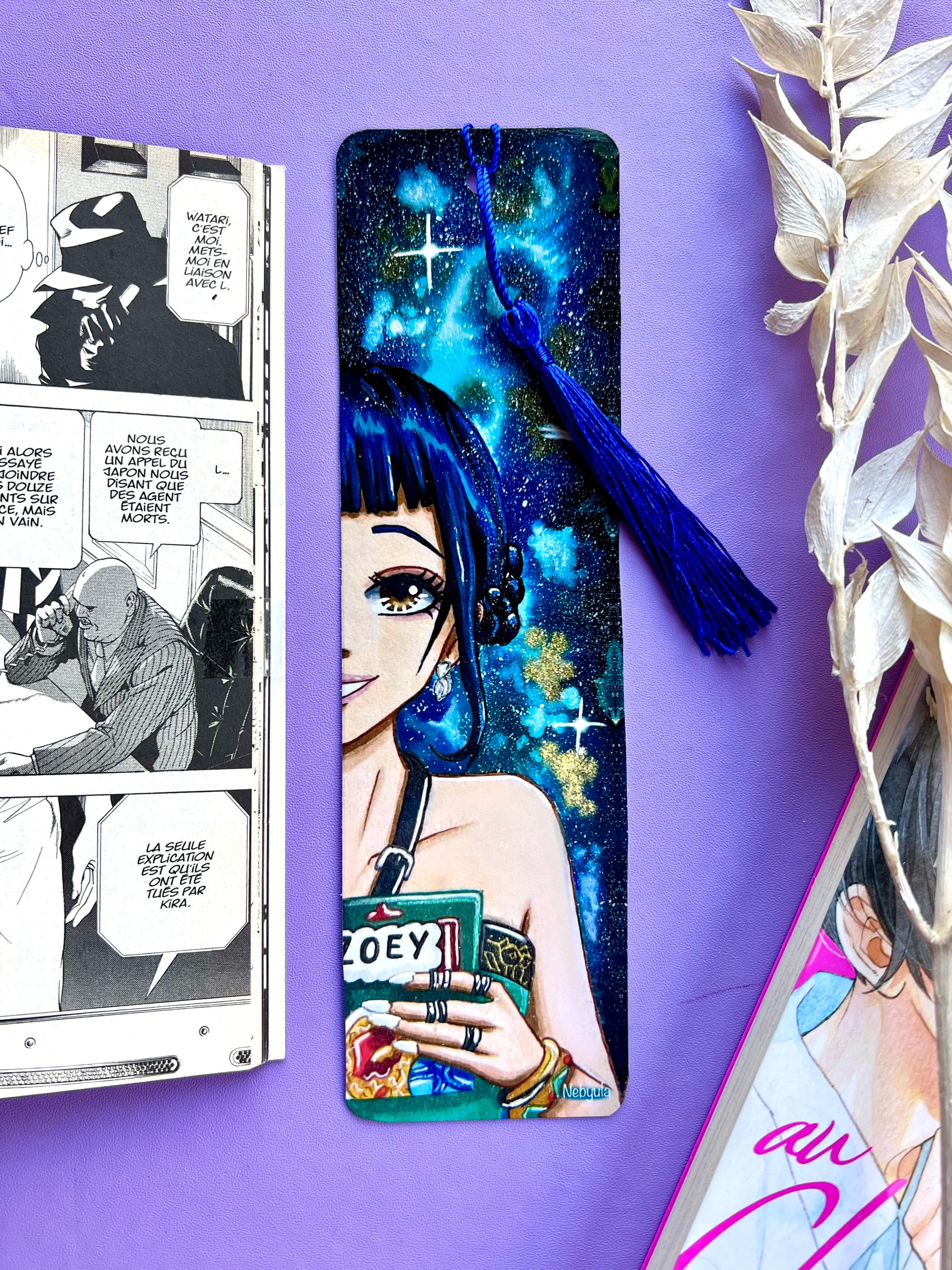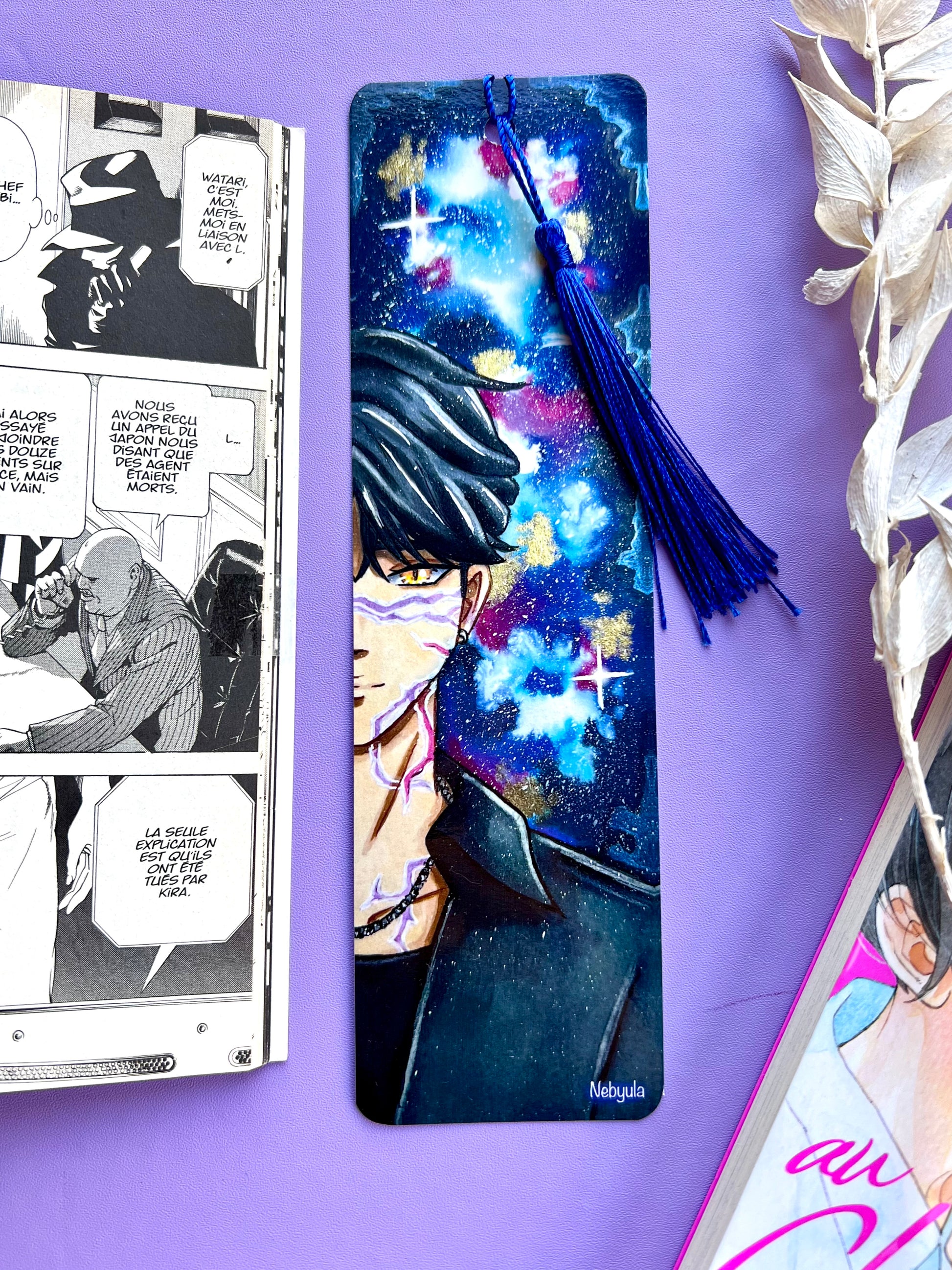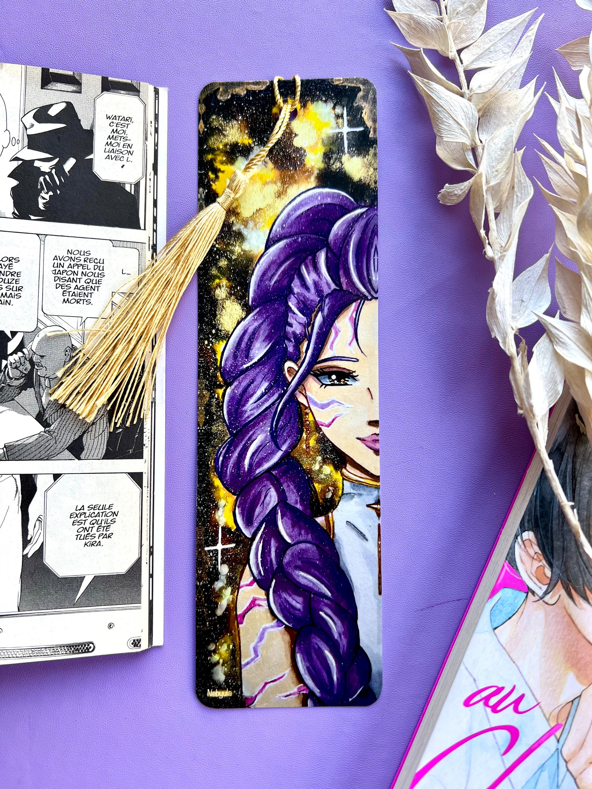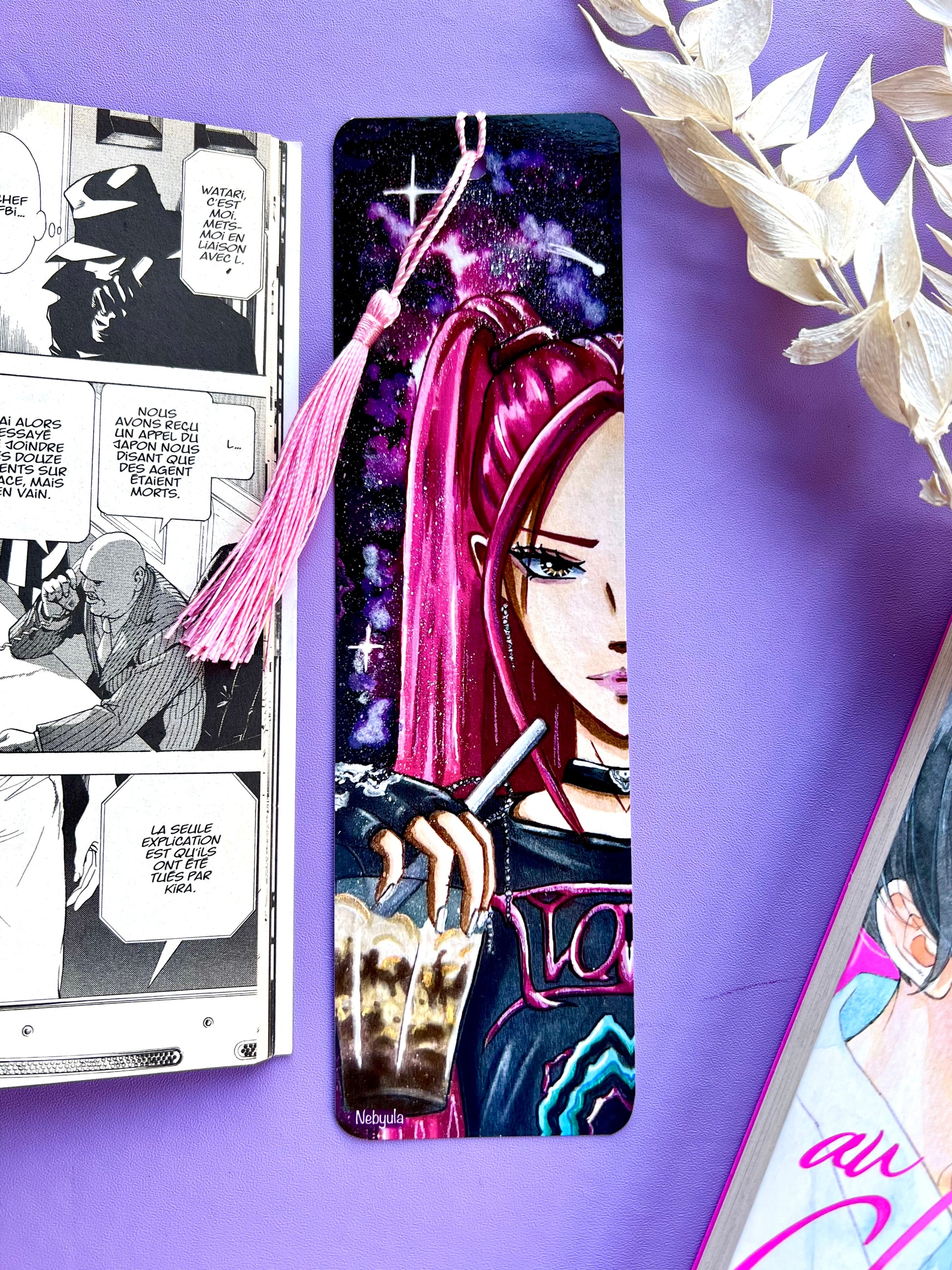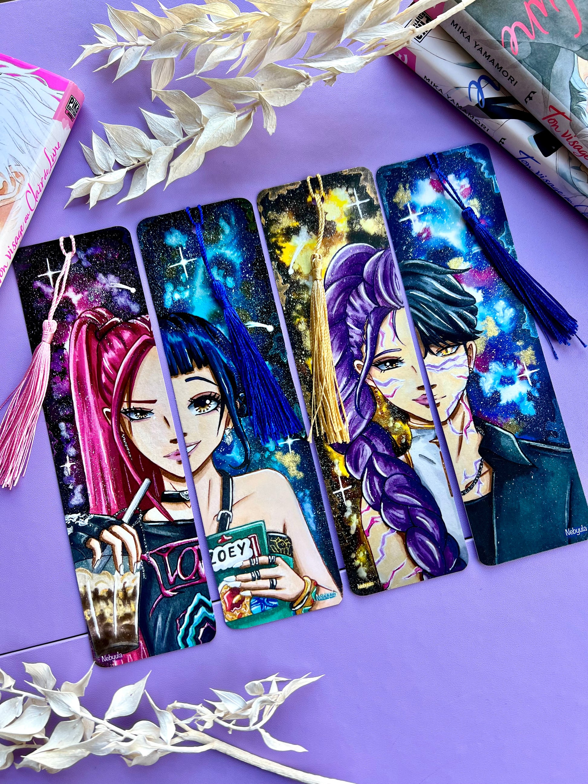 Marque-pages représentant des personnages issus du célèbre film Kpop Demons Hunters. Chaque design est soigneusement peint dans un style aquarelle éclatant, sublimé par un fond galactique étoilé à l'aquarelle.