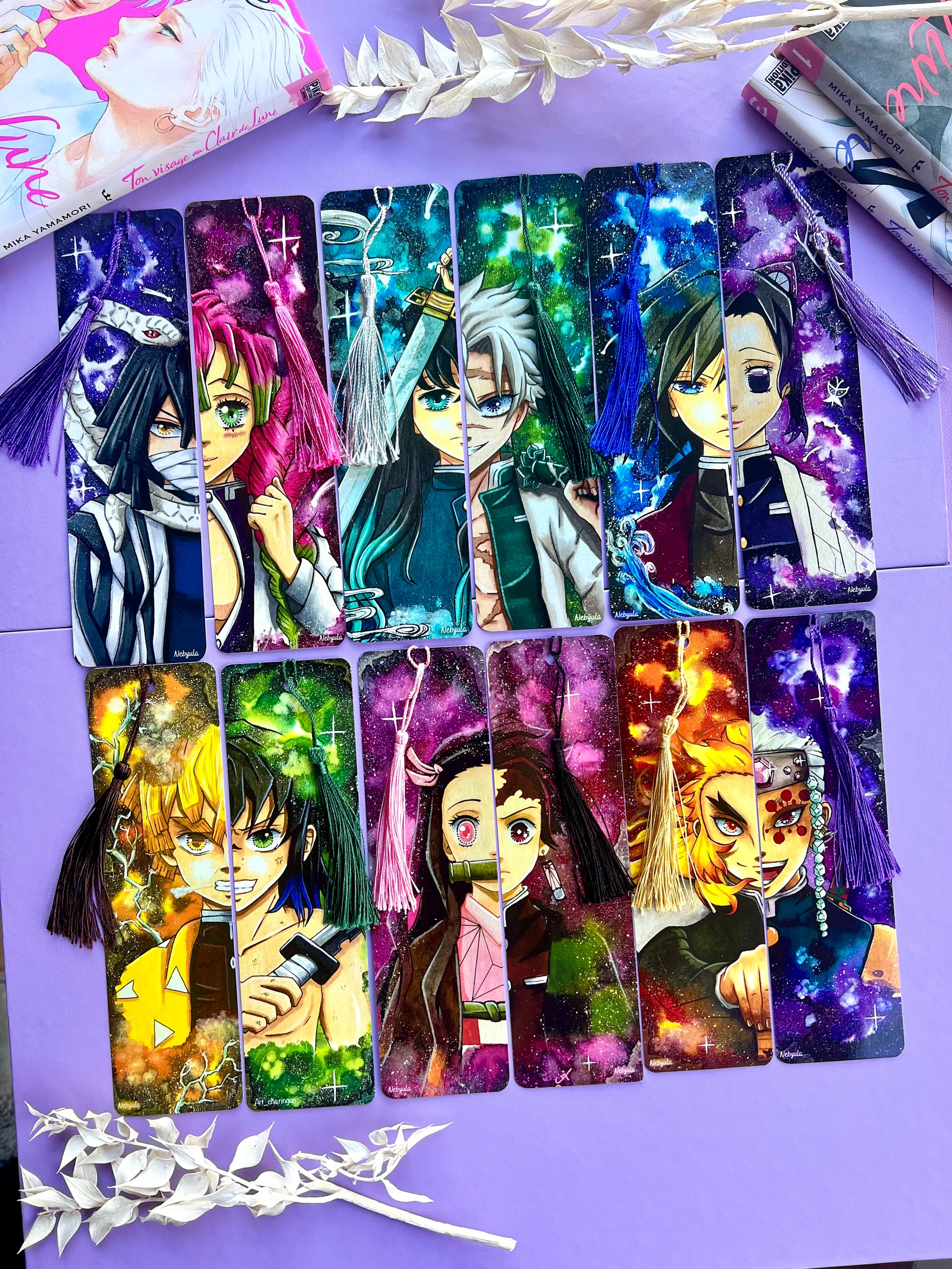 Marque-pages représentant des personnages issus du célèbre manga Pourfendeur de Démons. Chaque design est soigneusement peint dans un style aquarelle éclatant, sublimé par un fond galactique étoilé.